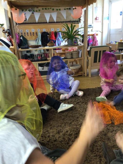 The children have been enjoying singing with scarves. They are following instructions and developing gross motor skills and hand eye coordination. We moved our scarves to the songs ‘10 fat sausages’ and ‘All the fish are swimming’.