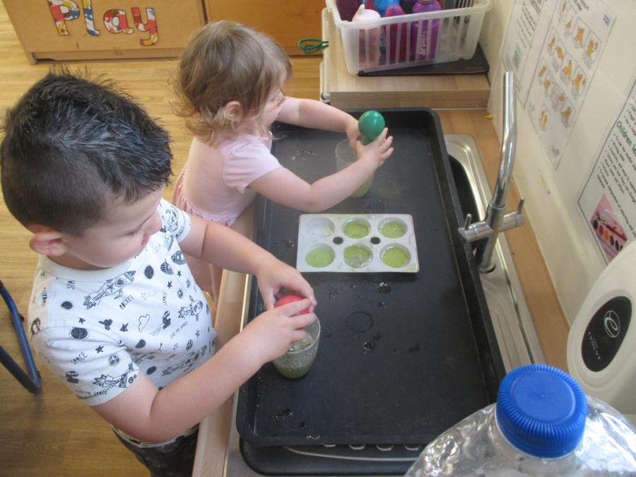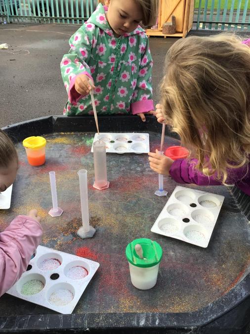 We have an inviting messy play area offering sand and water play, painting and lots opportunities to explore textures and colours. Some of our favourites are: