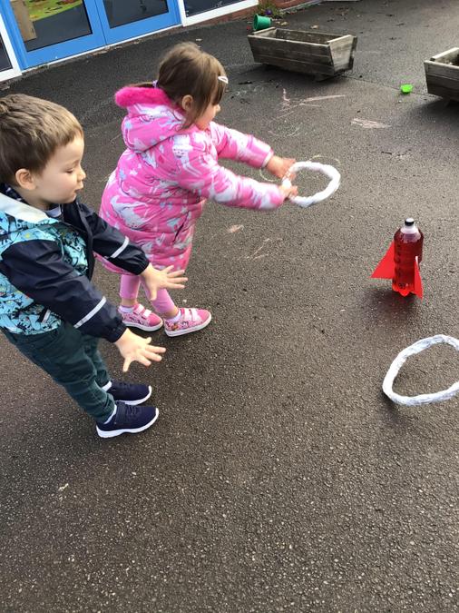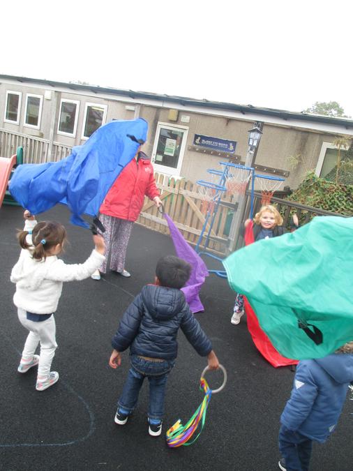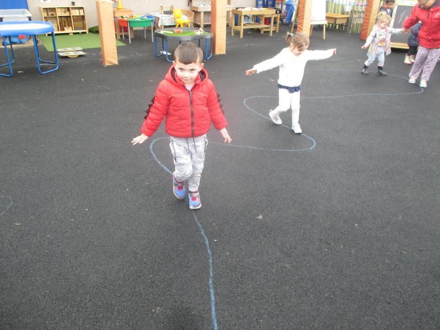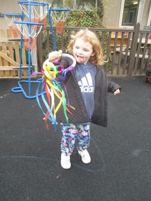 The children have opportunities to use balance bikes, trikes and scooters. We have a range of items that the children can access themselves such as balls, bats, hoops, beanbags, dancing ribbons and stilts.