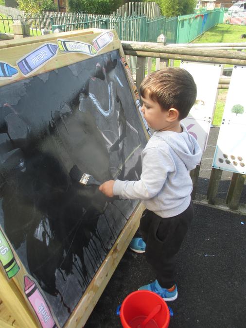 We provide many opportunities to explore mark making both inside and outside of the classroom. Chalk, pens, paint, mud, brushes, sponges, mops, sticks, feathers, pom poms and leaves are all great examples of resources that we use to make marks with.