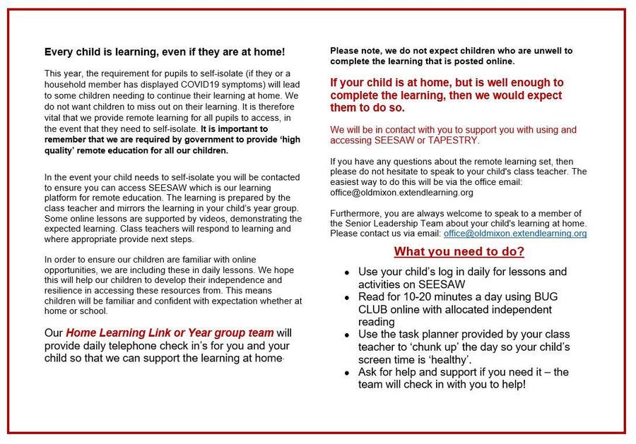 We understand that remote learning may provide some unique challenges with your children! We really want you to have fun with your children during the isolation period however we remain committed to continuing to provided high quality learning opportunities and continued connection with class teams and peers.