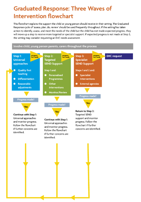 What is the Graduated Response? The SEND Code of Practice 2015 states that children and young people with SEND should have their needs met and outcomes achieved in a mainstream education setting; however, it also acknowledges that a specialist provider may be another option for a few children and young people.