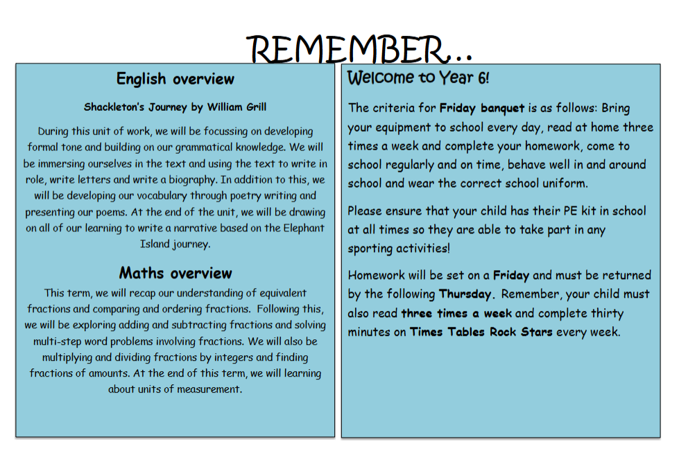 Our homework and reading homework is given out on a Friday, to be returned on the following Thursday.
